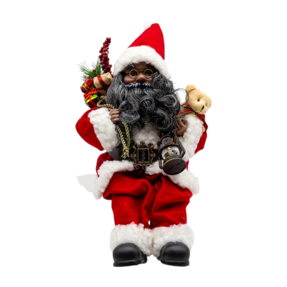 Lindo Papai Noel Negro com roupa vermelha tradicional.