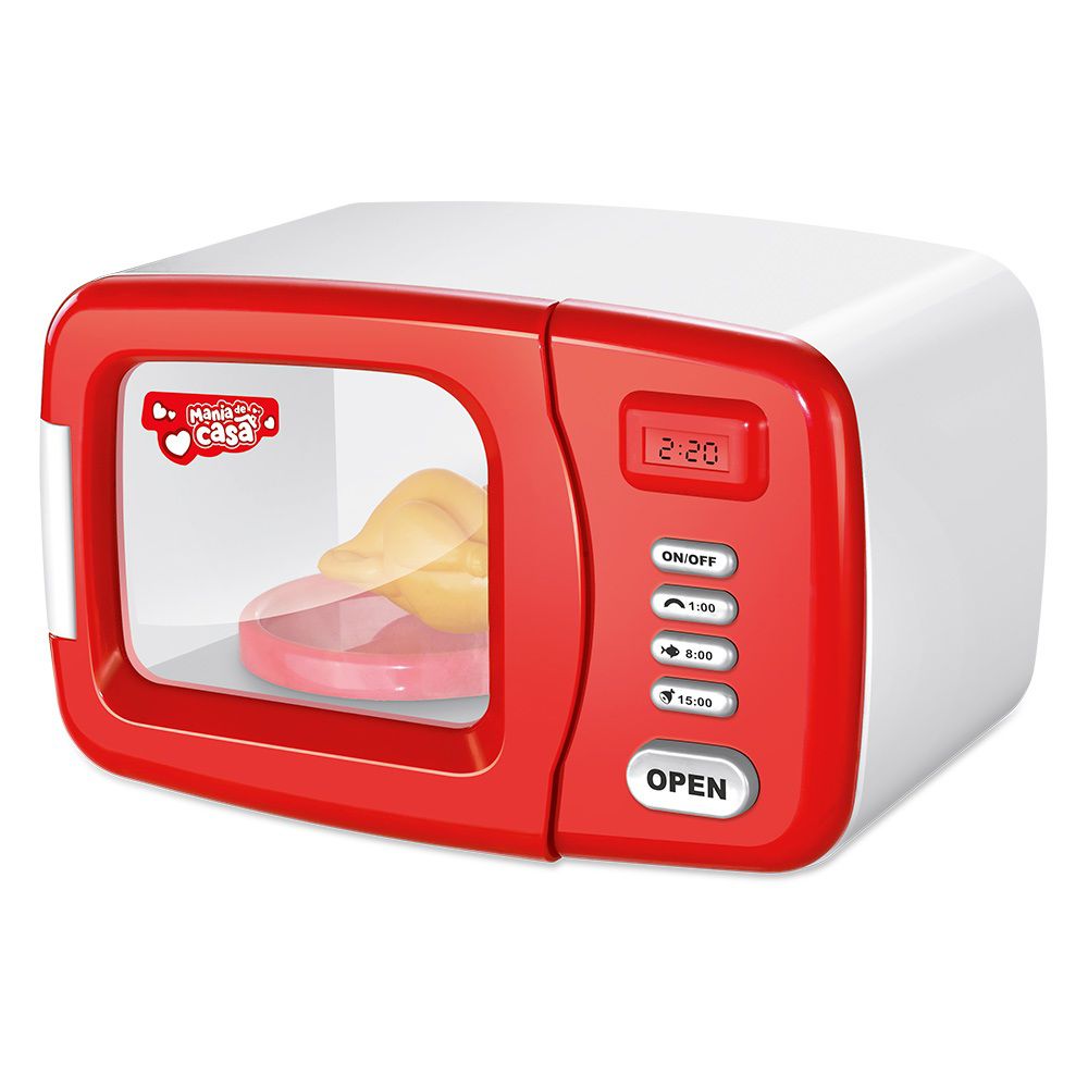 O micro-ondas é muito divertido, você aperta o botão ON/OFF ele acende uma luz e gira o pratinho igualzinho um de verdade.