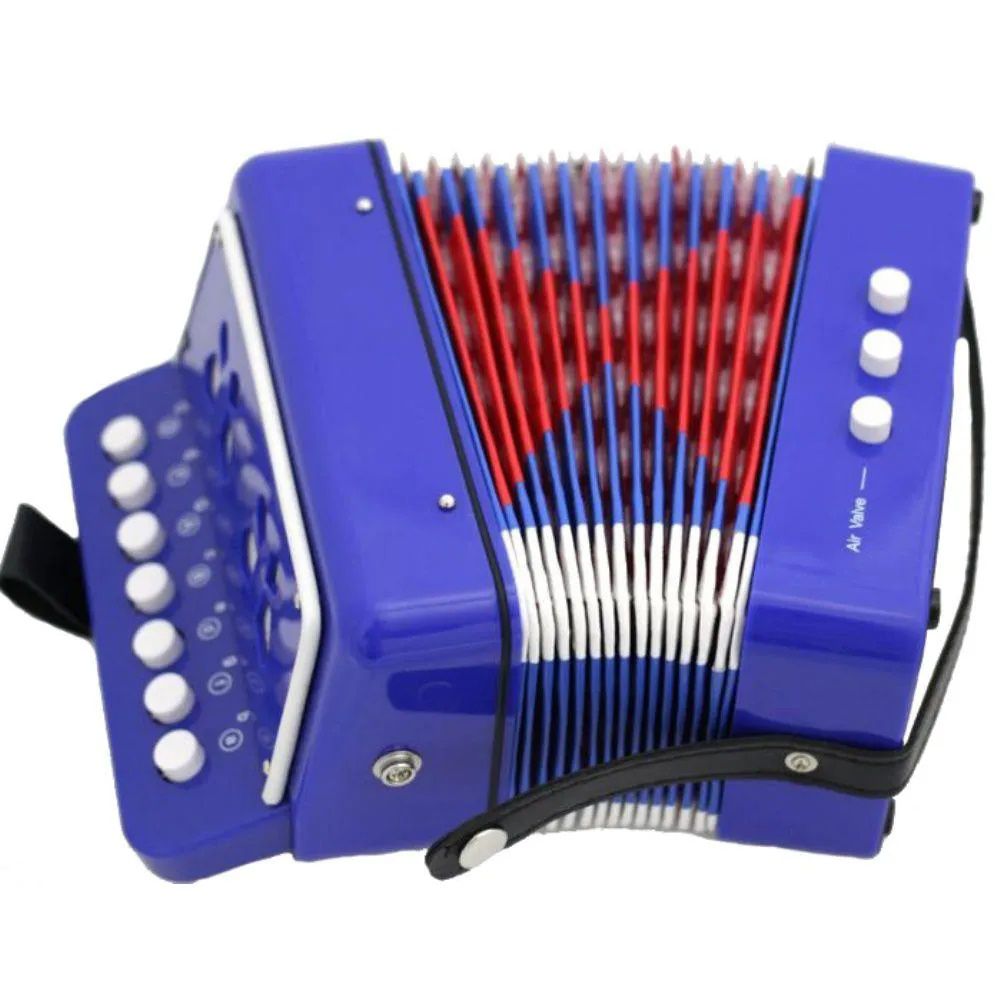 Acordeon mini com 7 botões e 3 baixos que emite som de verdade, perfeito para quem está se iniciando na música.