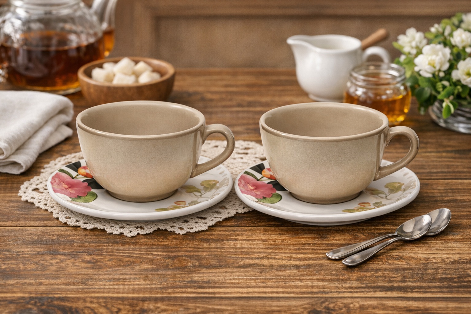 Cor, Xícara na cor nude e pires marfim com estampa floral
